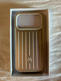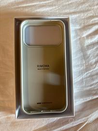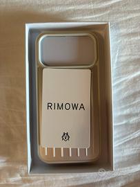 Elegante custodia RIMOWA per iPhone Pro Max, realizzata in alluminio con l'iconico design a scanalature, che richiama le valigie del marchio. Il colore argento e la finitura metallica conferiscono un aspetto premium, mentre il logo stilizzato aggiunge un tocco distintivo. Perfetta per proteggere il tuo telefono con stile, è Made in Germany e viene fornita nella sua confezione originale.