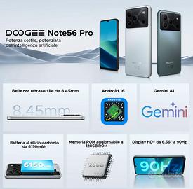 DOOGEE NOTE 56 PRO Android 16 Smartphone, 6150mAh Batteria, UNISOC T7225 Telefono, 6.56"HD+90Hz Display, 32GB+128GB, 13MP+8MP Cellulare, NFC/Widevine L1/Face Unlock/Side Fingerprint Recognition/3.5mm Headphone Jack