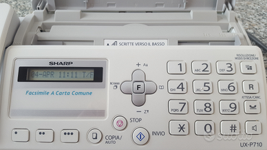 Fax/telefono SHARP UX-P710 a carta comune (con pellicola già montata), compreso pellicola aggiuntiva SHARP UX-31CR, cavo telefonico RJ11, spina tripolare RJ11, manuale e confezione. Consegna a mano.