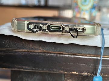 Vendo due placche con anelli per agganciare il cordino, compatibile con iPhone. Permettono di rendere qualsiasi cover compatibile con i lacci da mano/collo.