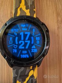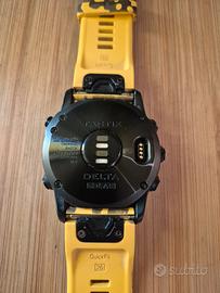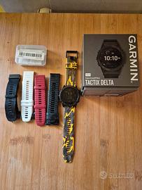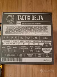 anni di vita tenuto maniacalmente cedo per passaggio a 8 incluso nel prezzo nr.4 cinturini clic clac sgancio rapido e 2 tattici in cordura 2 vetrini protettivi temperati carica batteria e scatola. Il tactix delta 7 Orologio Garmin Tactix Delta Solar Edizione balistica integra funzioni tattiche come per il paracadutismo è un orologio GPS per la frequenza cardiaca connesso di fascia alta progettato con materiali di qualità e resistenti militare MIL-STD-810). Ha una lente in zaffiro resistente ai graffi, una struttura in acciaio nero rivestito di carbonio amorfo e un fondello in acciaio. Grande cassa in polimero rinforzato da 51 mm con fondello in metalloDimensioni dello schermo da 1,4 pollici più grandi del 36% rispetto al modello precedenteDisplay MIP transflettivo antiriflesso Ultra resistente, conforme allo standard militare Gestione della musica con una capacità di archiviazione di 2000 braniCartografiaTopoActive Europe precaricata con dati per piste ciclabili, piste da sci, indicazioni di navigazione.Profili utente selezionabili in base al tuo sport (profili attività precaricati)Nouveau capteur cardio optique au poignet Garmin Elevate™ Chip GPS compatibile con GPS, Glonass e Galileo per un posizionamento preciso e veloce (anche in ambienti scoscesiTecnologia Pulse OX per la misurazione del livello di ossigeno nel sangue (sensore di acclimatamento)Soluzione di pagamento contactless Garmin Pay™Bussola elettronica a 3 assi con giroscopioAltimetro barometrico (calibrazione automatica)Sensori: vibrazione, accelerometro etemperaturaPersonalizzazione di quadranti e app gratuite (Connect IQ™) Funzioni di allenamento: VO2 Max, tempo, distanza, calorie, velocità, frequenza cardiaca, aiuto al recupero. Adattamento del VO2 Max e tanto altro