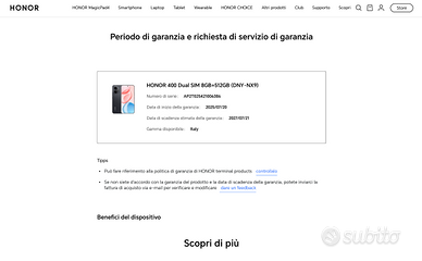 Vendo splendido Honor 400 5G, versione da 8GB di RAM e 512GB di memoria. Il telefono è letteralmente nuovo di zecca e mai utilizzato: è stato tirato fuori dalla scatola e acceso unicamente per verificarne il corretto funzionamento. La batteria ha infatti 0 cicli di ricarica effettuati. Lo metto in vendita in quanto ricevuto come omaggio aziendale. Essendo un premio non dispongo di scontrino, ma la garanzia ufficiale Honor è regolarmente attiva e verificabile in qualsiasi momento sul sito del produttore tramite il codice IMEI del telefono: 🛡️ Data di inizio garanzia: 20 luglio 2025 🛡️ Data di scadenza stimata: 21 luglio 2027 🚀 I punti di forza di Honor 400 5G: 8GB di RAM e ben 512GB di memoria interna Fotocamera Impressionante: Sensore principale da ben 200 MP (con stabilizzazione ottica e Intelligenza Artificiale) per scatti pazzeschi e ultra-nitidi. Batteria da 5300 mAh con ricarica ultra-rapida SuperCharge. Schermo AMOLED da 6.55" Design Premium: Profilo sottilissimo ed elegantissimo, con un peso piuma di soli 184 grammi. 💎 Cosa riceverai: Smartphone Honor 400 5G 12/512GB (condizioni da vetrina, intonso). Scatola originale completa di tutti gli accessori di fabbrica (ovviamente mai toccati o srotolati). Disponibile per lo scambio a mano a ROMA SUD per visionarlo di persona e accertarvi che è esattamente come uscito dalla fabbrica. Sono disponibile anche alla spedizione sicura e tracciata tramite TuttoSubito. Prezzo leggermente trattabile se davvero interessati. No perditempo e no scambi. Scrivetemi in chat per qualsiasi domanda o per ulteriori foto!