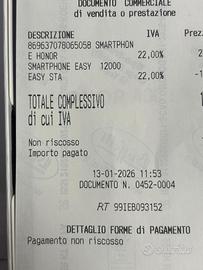 VENDO Honor 400 Lite 5G – 256GB – Blu – NUOVO SIGILLATO – Garanzia 24 mesi Vendo Honor 400 Lite 5G 256GB, colore velvet Black, NUOVO, ancora sigillato nella confezione originale. È stato acquistato in stock e non è mai stato aperto né attivato. 📅 Scontrino del 13 gennaio 2026 👉 Garanzia ufficiale 24 mesi valida fino a gennaio 2028. 💶 Prezzo di listino: 299 € Lo vendo a un prezzo decisamente più conveniente. ⭐ Perché è un’occasione Prodotto nuovo di negozio, ma a prezzo ribassato Garanzia piena e documentata ( come da scontrino) Versione 256GB, la più richiesta Colore elegante e moderno Prestazioni eccellenti per foto, social, lavoro e intrattenimento 🔧 Caratteristiche principali 5G ultra‑veloce Display AMOLED 6,7" 120Hz Memoria 256GB + 8GB RAM Fotocamera 108 MP Batteria 5230 mAh Dual SIM + eSIM ( 2 Nano) Colore: Blu Si vende come nuovo con scontrino e relativa garanzia