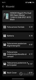 Vendo scocca posteriore nera dell Honor Magic 5 pro originale (con marchio CE). I segni che vedete riguardano i bordi del vetro delle fotocamere da cambiare, se volete.. Solo la scocca originale costa nuova 97 euro come potete vedere dalla schermata estratta dal sito Honor.. Scambio solo a Brescia città.