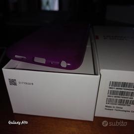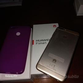Huawei P smart usato, tenuto bene, con una piccolissima scheggiatura tondeggiante superiore che non è estesa nel corso degli anni, e non ne impedisce il funzionamento, cover fucsia, e caricabatterie