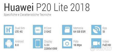 Vendo Huawei P20 Lite 2018 è un smartphone Android con display Touchscreen da 5.84 pollici con una risoluzione di 2280x1080 pixel, modulo LTE 4G che permette un trasferimento dati e una navigazione in internet eccellente, passando per la connettività Wi-fi e il GPS.