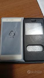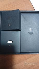 Scatola completa di tutto (alimentatore e cavo di ricarica, cuffiette cablate originali Huawei mai usate, libretti, ecc.) più una cover a libro nera.