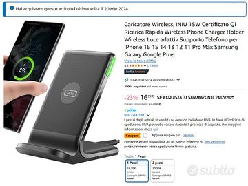 CARICATORE WIRELESS INIU 15W Certificato Qi, ricarica rapida e non disturba il sonno.