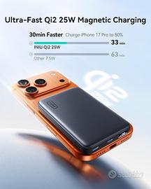 Ricarica wireless ultra veloce Qi2 da 25W Ricarica il tuo iPhone 17 Pro dallo 0% al 50% in soli 33 minuti, fino a 30 minuti più veloce rispetto ai power bank magnetici standard da 7,5W. Ricarica cablata rapidissima fino a 45W Il cavo USB-C integrato (rimovibile) consente una ricarica super veloce: iPhone 17 Pro dal 20% al 78% in circa 25 minuti, ideale quando hai poco tempo. Display digitale intuitivo Il display integrato mostra in modo chiaro il livello della batteria e lo stato di ricarica. Perfetto in viaggio Con capacità da 10000mAh (compatibile TSA per i voli), offre fino a 1,8 ricariche per iPhone 17, superando nettamente le batterie da 5000mAh. Perfetto per viaggi, lavoro e spostamenti quotidiani. Il power bank magnetico Qi2 da 10000mAh più sottile sul mercato Con uno spessore di soli 1,3 cm, entra facilmente in tasca o in borsa offrendo tutta la potenza di una batteria da 10.000 mAh senza ingombro. Qualità INIU con 3 anni di garanzia Scelto da oltre 38 milioni di utenti, INIU garantisce ricariche sicure grazie a materiali di alta qualità. Con il supporto INIU di 3 anni, in caso di problemi ricevi una sostituzione gratuita.