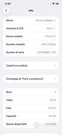 Vendo iPhone 11 da 64GB, nero, ancora funzionante e aggiornato all’ultima versione iOS. Il display nell’angolino in alto a destra è un po’ scolorito, ma non dà alcun problema - negli screenshot il difetto non c’è. Batteria da sostituire benché funzioni benissimo. Con scatolo ma senza cavo né cuffiette né pin per inserire la sim (si ovvia con graffetta che fornisco).
