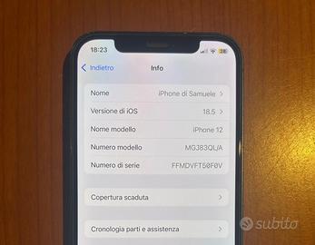 Vendo iPhone 12 per passaggio a nuovo modello. Il telefono è perfettamente funzionante, ma presenta alcuni difetti tecnici ed estetici dovuti all'usura e a una caduta. La lente principale (1x) fatica a mettere a fuoco, specialmente da vicino. Il Grandangolo, invece, funziona perfettamente. Il vetro posteriore presenta crepe/danni (come visibile in foto), ma la struttura del telefono è solida. Stato di salute della batteria è al 72%. Il telefono tiene ancora la carica ma suggerisco la sostituzione per prestazioni ottimali. La scocca inferiori presenta alcuni graffi. Includo 2 cover e due vetrini nuovi. Scrivere per info e maggiori foto!