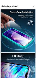 Per iPhone 12 MINI vetro temperato in Armorite, marca ESR, il migliore, con bordino nero arrotondato, resistente 9h, anti impronta, facile da applicare grazie ad un telaio in plastica che lo centra perfettamente sul telefono.