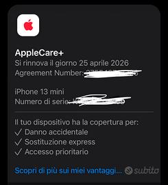 Vendo iphone 13 mini 128gb colore mezanotte con applecare+ rinnovata fino ad aprile su qualsiasi danno,accidentale e non, batteria e schermo sostituiti con apple care+ il giorno 26 gennaio 2026 quindi nuovi di fabbrica originali apple, come testimoniano le foto,telefono sempre tenuto in modo maniacale sempre con cover, vetro protettivo e coprilenti fotocamera, il telefono e’ ancora coperto da apple care+ ed e’ completo di scatola e adesivi e manualistica originali,per qualsiasi info e foto contattatemi, disponibile per il ritiro a mano zona palmi o paesi vicini prezzo trattabile