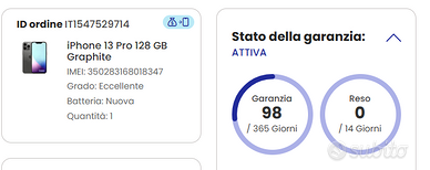Vendo - causa passaggio ad Android - iPhone 13 Pro Graphite 128GB ricondizionato, acquistato su Swappie il 16 Maggio 2025.