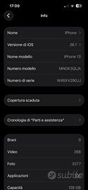 Vendo iPhone 13 da 128GB, colore verde, acquistato l’8 dicembre 2022. Il dispositivo è completo di scatola e accessori originali. La batteria è stata sostituita con una compatibile ad agosto 2025, garantendo così una maggiore durata. È in ottime condizioni generali, con lievi segni di usura. Disponibile per la visione e posso inviare foto su richiesta.