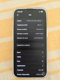 Vendo iPhone 14 colore bianco in ottime condizioni 128 GB di memoria, tutto originale, Telefono e carica batteria e due cover, batteria al 85 percento