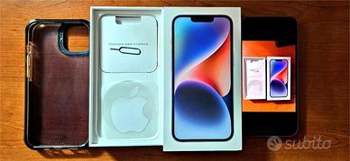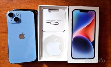 Vendo iPhone 14 blu 128GB, originale Apple, completo di scatola con clip SIM e cavo + adesivo Apple. Inclusa cover trasparente Cellularline usata, rigida molto resistente.