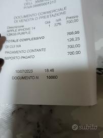 iPhone 14 colore lilla completo di scatola scontrino caricabatterie e varie custodie