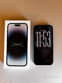 vendo iphone 14 pro nero da 128 gb, condizioni ottime, schermo senza graffi, posteriore e fotocamera senza graffi, tutto funzionante, lateralmente ottimo tranne per 1/2 puntini che sono normale segno di utilizzo, stato della batteria all’81% (come si puo vedere in foto), cavo di ricarica originale presente ma rovinato+ un cavo di ricarica di un altra marca in condizioni perfette perché comprato da poco, scatola originale presente, presente un vetrino di protezione gia installato+ un altro nuovo. Mai riparato
