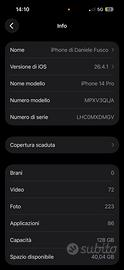 ACCETTO SCAMBIO A MANO A ROMA O SPEDIZIONE. Vendo iPhone 14 Pro nero con memoria da 128GB, stato della batteria all'80%, condizioni ottime, minimo segni di usura, schermo senza gratti e usato sempre con vetrini di protezione, fotocamera perfetta e funzionante, retro senza graffi e usato sempre con cover, acquistato su amazon nel 2023 e ho la ricevuta e credo anche la fattura. do il cavo originale ma poco rovinato+ cavo da amazon perfetto, vetrino di protezione già installato+vetrino di protezione di ricambio.