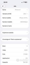 Vendo iPhone 14 Pro con 256 GB di memoria, in elegante colorazione Silver, versione con ampia capacità di archiviazione ideale per foto, video e applicazioni. 🔋 Batteria nuova originale Apple Il dispositivo è stato dotato di batteria nuova originale Apple, con stato batteria 100%, per garantire massima autonomia e prestazioni ottimali. 🔧 Completamente originale Il telefono è tutto originale Apple, mai modificato né riparato con componenti non originali. 💾 Memoria 256 GB Ampia capacità di archiviazione perfetta per gestire senza problemi foto, video, app e file. 📌 Condizioni estetiche Telefono in ottime condizioni generali, presenta solo qualche segno di usura sulla scocca laterale, che non influisce sul funzionamento. Acquistando il prezzo dell’annuncio, in regalo il caricabatterie originale Apple. Telefono libero per tutti gli operatori, già resettato e pronto all’uso. Disponibile per qualsiasi informazione o ulteriori foto. Prezzo non trattabile.