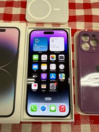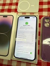 Vendo IPhone 14 Pro Max 128GB Purple pari al nuovo senza graffi perfettamente funzionante Completamente originale Face ID funziona IOS 26.3 ultimo aggiornamento Apple Magsafe caricatore wireless in omaggio Scatola,cover nuovo ,cavo originale incluso Prezzo non trattabile assolutamente Ritiro in zona solo Bologna Non faccio spedizioni