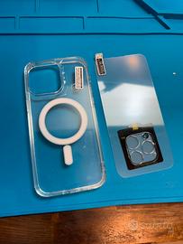 Spedisco insieme ad una pellicola protettiva in vetro che sarà già applicata sullo schermo, una cover trasparente magsafe nuova e un vetrino per le fotocamere