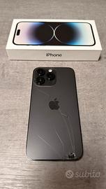 iPhone 14 Pro Max 256GB grigio siderale, perfettamente funzionante, batteria 88%, presenta scocca posteriore danneggiata, da sostituire. Lenti fotocamere/videocamere intatte.