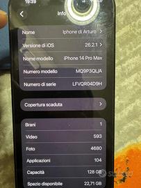 iPhone 14 pro max da 128 gb nero tenuto manialcalmente ho scatola lo vendo per passaggio ad altro telefono già in mio possesso quindi non scambio . Consegna a mano non spedisco zona Battistini metro . Vendo a 500 includo cover .