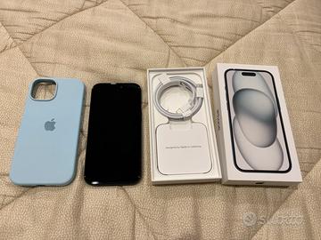 Iphone 15 nero, 128 gb con cover magsafe celeste, salvaschermo privacy. Primo utilizzo 25/12/2023, Come nuovo senza graffi, stato batteria normale.
