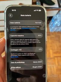 Vendo iPhone 15 128 Gb con 90 % di batteria. È stato tenuto maniacalmente , soprattutto per quanto riguarda batteria e carica. Presente due graffi un po piu evidenti, nei primi giorni non ho avuto la cover. Sono stati evidenziati con il flash in completa ombra , altrimenti non si notano. Per il resto non ha difetti o bordi scheggiati. Vendo insieme a cavo e custodia. Completo di scatola. Il telefono è pronto per essere utilizzato , vendo per passaggio a modello successivo.