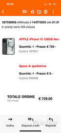 VENDO IPHONE 15 NERO 128 GB NUOVO CON SCATOLA ACQUISTATO OGGI 15/07/2025 DA MEDIA WORLD .