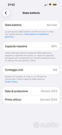 Vendo IPhone 15 nero da 256 gb, tenuto in ottime condizioni, il telefono non ha neanche un graffio allo schermo perché é stato sempre tenuto con il poliuretano, non ha nessuna ammaccatura, solo qualche piccolo segno di usura nei bordi. La percentuale della batteria é dell' 84%. Vendo tutto con scontrino, caricabatterie e scatola originale.