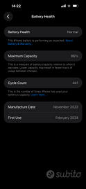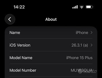 Vendo iPhone 15 Plus da 128 GB, in condizioni pari al nuovo. Usato sempre con cura, nessun graffio, nessun segno, mai caduto. Il telefono ha avuto AppleCare+ attivo (ancora attivo) fin dal primo giorno, quindi è stato sempre controllato, protetto e mantenuto in condizioni eccellenti. Batteria in ottimo stato •Salute batteria: 86% •Cicli: 441 •Prima attivazione: Febbraio 2024 Incluso nella vendita •iPhone 15 Plus •Cavo USB C originale •Pellicola privacy nuova mai utilizzata •Due cover MagSafe (rossa e verde) Dettagli aggiuntivi •Funziona perfettamente in ogni sua parte •Nessun blocco, nessuna restrizione •Aggiornato all’ultima versione di iOS •Sempre tenuto con cover e protezione