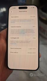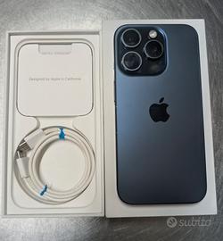iPhone 15 pro 128gb in colorazione Blue Titanium. nessun malfunzionamento completamente originale tranne che per il cavetto di ricarica. allego foto con stato della batteria. resto a disposizione per qualsiasi chiarimento Grazie.