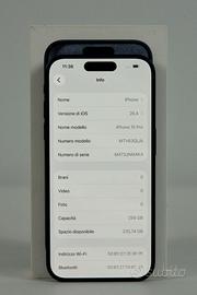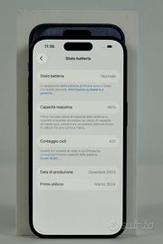 Sono un rivenditore, emetto regolare fattura di vendita IVA 22% per i possessori di partita IVA, equivalente scontrino per acquirente privato garanzia 3 mesi batteria esclusa PREZZO NON TRATTABILE Iphone 15 Pro colore Blue Titanium memoria 256 GB piccoli segni sullo schermo visibili solo in contro luce a schermo spento da acceso non si vede nulla provato a fotografarli non si riesce. batteria 86% con 621 cicli nessuna riparazione eseguita nessuna parte sostituita tutto originale completo di scatola originale e cavo originale