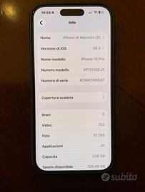 Vendo iPhone 15 pro 256 gb in perfetto stato, senza segni di usura o ammaccature, sempre utilizzato con vetro protettivo e cover ( 5 cover in omaggio), completo di imballo e documento di acquisto