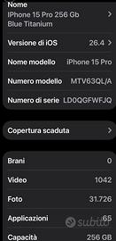 Iphone 15 pro Blu’ 256 Gb Italia acquistato alla Apple in perfette condizioni completo di scatola Batteria al 89 % di capacità massima batteria in stato normale Vetrini della fotocamera perfette, senza graffi Casse e microfoni perfetti, audio pulito usato sempre con auricolari Apple cover piu vetrino Display Connettore di ricarica mai dato problemi utilizzo quotidiano Mai effettuate riparazioni, tutto originale ho pubblicato il nm di serie per qualsiasi controllo al numero verde Apple per qualsiasi altre info contattare : 329-1423683 Gianluca