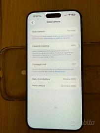 Vendo iphone 15 pro max, 256, blu titanium, in ottime condizioni. Telefono acquistato ad ottobre 2023, con batteria al 89% di efficienza, sempre tenuto con custodia (che regalo) e coprischermo (leggermente isurato). Scatola originale, con cavo di ricarica.