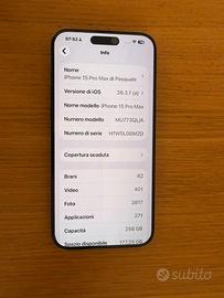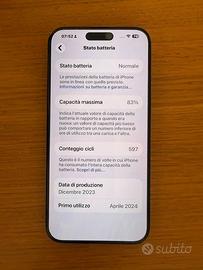 Vendo Iphone 15 pro max 256 gb in condizioni maniacali perfetto senza nessun graffio con scatola originale Apple perfettamente funzionante, nessun difetto, nessun graffio. Cambio per passaggio a 17 PRO MAX. Batteria 83% (con una ricarica utilizzo l'iPhone tutto il giorno). Scrivetemi per ulteriori info