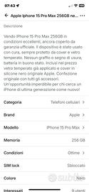 Vendo iPhone 15 Pro Max 256GB in condizioni eccellenti, ancora coperto da garanzia ufficiale. Il dispositivo è stato usato con cura, sempre protetto da cover e vetro temperato. Nessun graffio o segno di usura, batteria in buono stato. Inclusi nel prezzo vetro temperato gia applicato e cover in silicone nero originale Apple. Confezione originale con tutti gli accessori.