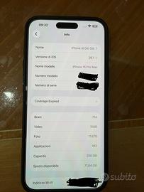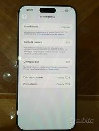 Vendo Iphone 15 Pro Max 256 gb color Titanio Naturale tenuto eccezionalmente , sempre e solo con cover e pellicola , pertanto non presenta ne graffi ne ammaccature e a livello software funziona benissimo E stato acquistato nuovo a settembre 2023 quindi non è piu in garanzia. La batteria , come si evince in foto è all ‘ 81% Non accetto permute
