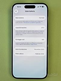 Vendo iPhone 15 Pro, colore grigio titanio, 128 GB, in condizioni pari al nuovo. Sempre utilizzato con custodia e pellicola protettiva, quindi privo di graffi o segni d’usura. Perfettamente funzionante. Soluzione con sola e-sim