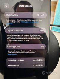 iPhone 16 128gb Colore Nero In garanzia Apple fino ad Agosto 2026 e Vodafone fino ad Agosto 2027 Batteria al 100 % con soli 141 cicli di ricarica Perfetto, nessun segno di usura , nessun difetto. Sempre tenuto con pellicola protettiva e cover. Comprensivo di scatola originale ma senza cavo. Posso fornire altre foto su richiesta. Solo consegna a mano no spedizione. Non fate offerte sotto i 500 perchè non rispondo nemmeno.