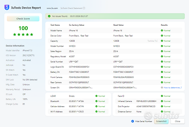 Vendo iPhone 16 nella colorazione Blue Marine da 128GB. Il telefono è stato acquistato ad un'asta insieme ad altri telefoni e viene venduto nello stato in cui si trova, con le seguenti caratteristiche: Estetica: La scocca è immacolata (pari al nuovo), mentre il vetro anteriore presenta dei graffi visibili come da foto. Componenti: Schermo e batteria provengono da un altro iPhone (risultano come componenti non originali/bloccati nelle impostazioni, ma funzionano perfettamente). fornisco anche una batteria in perfette condizioni originale al 95% cosi da rimuovere l'errore usando il riparatore apple sul telefono uno schermo sostitutivo per chi volesse rimuovere l'errore costa pulled o senza errore sui 90/167€ posso anche montarlo gratuitamente dopo ricezione per chi volesse ogni errore azzerato. Funzionamento: Il telefono è perfettamente funzionante in ogni sua parte. Testati e funzionanti: Face ID, Wi-Fi, ricezione, altoparlanti e fotocamere pulsanti ricarica wireless. Stato Batteria: Solo 85 cicli di ricarica, salute al 100%. Il telefono è sbloccato e pronto all'uso. Venduto visto e piaciuto, ideale per chi cerca l'ultimo modello a un prezzo ridotto e non si cura degli avvisi sui componenti sostituiti o nel caso volesse sostituirli per averlo perfetto