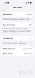 La batteria è ancora al 96% della sua capacità con solo 249 cicli di ricarica. Data di produzione: gennaio 2025, primo utilizzo: marzo 2025, quindi ha meno di un anno di vita.