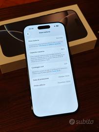 Colore nero - 256 gb. Smartphone acquistato a dicembre 2024 su sito Apple. Nessun graffio o segno, ne su display, ne su retro, ne su bordo e fotocamera. Usato sempre con cover Spigen che regalo. Batteria al 98%. Telefono in perfettamente funzionante. Consegna a mano o spedizione.