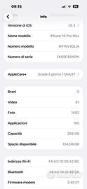 IPhone 16 Pro Max 256 Gb, con Apple Care Plus attiva sino al 11/04/2027, col 100% della capacità batteria e soli 181 cicli di ricarica, tutto originale in ogni suo componente, perfettamente funzionante e esente da difetti estetici, mai oggetto di revisioni, riparazioni, controlli, ma soprattutto MAI caduto e SEMPRE tenuto, sin dall'apertura della scatola, nella custodia Bumper con vetro protettivo installato. Questo la descrizione. SE CERCATE DI SPENDERE MENO, passate ad altri venditori, con telefoni fuori protezione Apple Care, con componenti sostituiti o riparati, con righe o malfunzionamenti o anche solo con batterie al di sotto del 100%.
