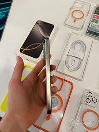 Vendo Phone 16 Pro Max da 256 Gb , colore Titanio . Miglior colore sul mercato . Iphone tenuto in maniera maniacale , da vero amatore , perfetto in tutto, cavo per caricarlo nuovo mai usato, neanche scartato (visibile in foto). Batteria al 97% perfetta . Telefono sempre tenuto con la cover e tenuto con pellicola protettiva in vetro temperato sia sullo schermo che sulle tre fotocamere posteriori. Oltre al cellulare do cover tutte nuove , pellicole in vetro temperato e protezioni sempre in vetro temperato per le 3 fotocamere posteriori. Tg : iphone 17 pro max , iphone 17 pro , iphone 16
