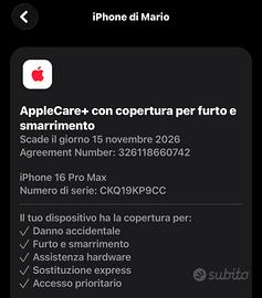 Vendo Iphone 16 Pro Max 256 Gb bianco acquistato ad Ottobre 2025,pari a nuovo senza graffi o altro Batteria effettiva 100% Con 8 cover,di cui 2 originali trasparenti Apple pagate €60,00 caduna Applicata pellicola nuova da Gamelife (ex Gamestop) con scontrino,in data recente (1 settimana fa) Compresa Apple Care+ con scadenza a Novembre 2026 (€ 30,00 sostituzione di un componente, € 99,00 sostituzione completa per rotture evidenti o non funzionamento totale)